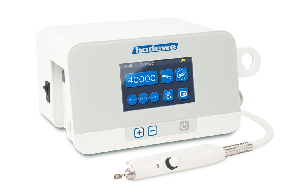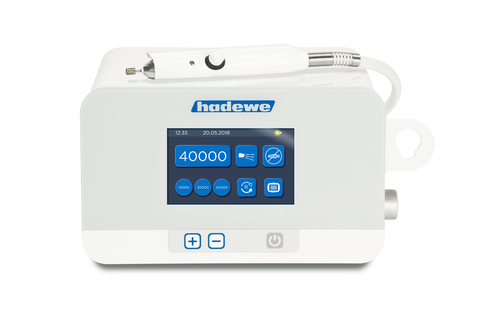 The handpiece is equipped with a unique, patented clamping system. A chuck will open inside the handpiece by pressing the well-known hadewe knob forward. The instrument can now be entered into the unit without any resistance. This is especially important with smaller, sharp edged tools, since they can cause injury, if you need too much force to enter an instrument.