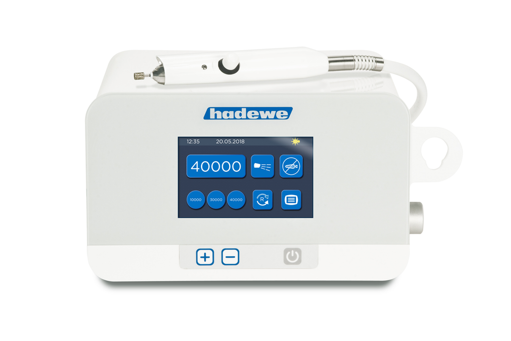The modern touch screen display makes work much easier in many ways. Preferred speeds are to be seen directly on the touch display. Help videos describe the most important features and make the first steps foolproof. Instructions (e.g. change of washers, clean chuck etc.) can be displayed on the monitor. With the help of an USB stick you can show your clients your own pictures, for example to illustrate their treatment progresses.